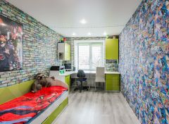 Гостиная — это сердце квартиры, где вы сможете разместить всю необходимую мебель для комфортного отдыха и встреч с друзьями. Две уютные спальни идеально подойдут для вашей семьи: одна из них — это детская с компьютерным столом и двумя кроватями, а окно выходит во двор, что обеспечивает тишину и спокойствие.