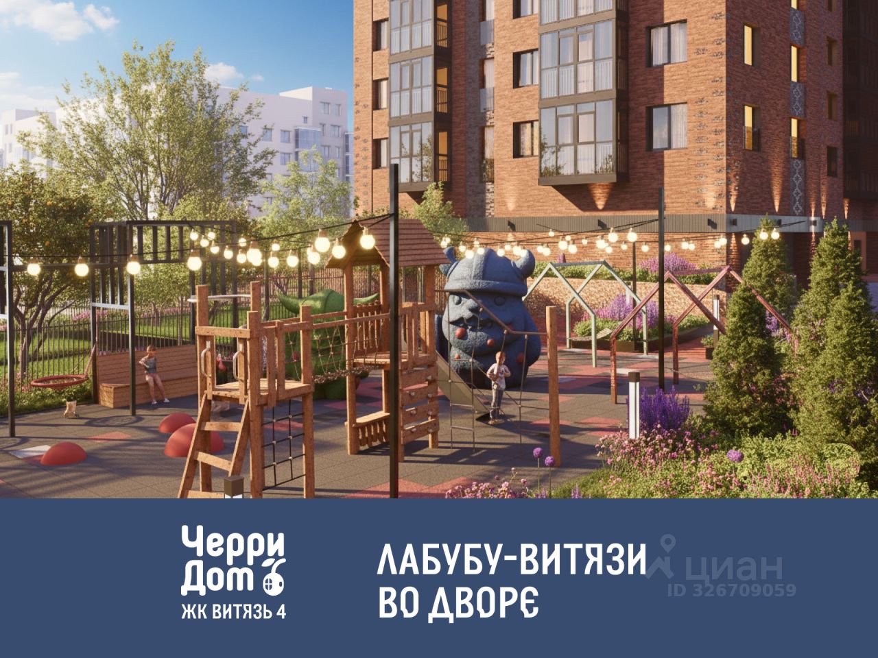 Закрытая территория без машин. Вишнёвый сад, липы и берёзы, хвойные растения круглый год. Качели, подвесные гамаки, детская площадка с лабиринтом-викингов и стилизованные скалодромы в виде семьи витязей. Прогулочные аллеи с арт-объектами. Вечером включается мягкая подсветка — двор, куда хочется выходить каждый день.