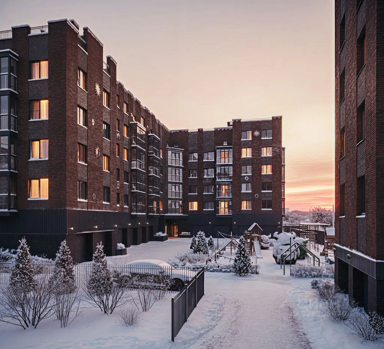 Территория закрыта и полностью освобождена от машин. Двор задуман как авторский сад: многоуровневое озеленение, взрослые деревья, цветущие кустарники и сезонные растения создают ощущение парка у дома. Пешеходные дорожки из брусчатки, места для отдыха, навесы и световые сценарии делают пространство комфортным в любое время дня.