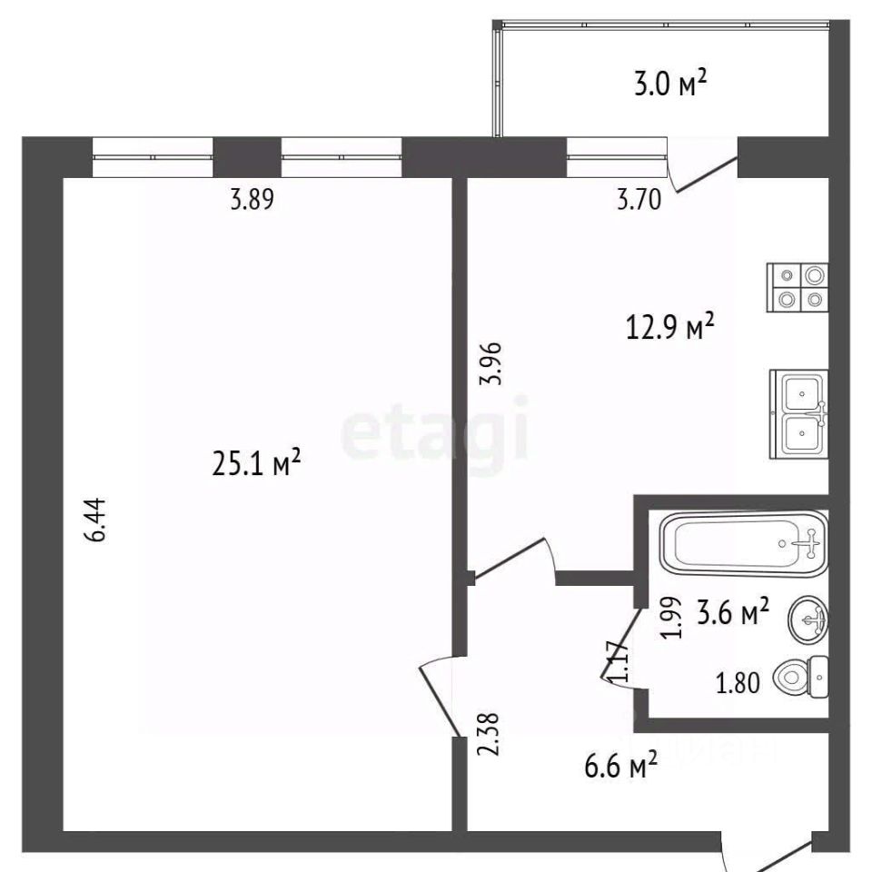 Комната большая и светлая с двумя окнами, легко зонируется на две зоны, кухня квадратной формы, с выходом на 3х-метровый застекленный балкон.