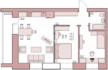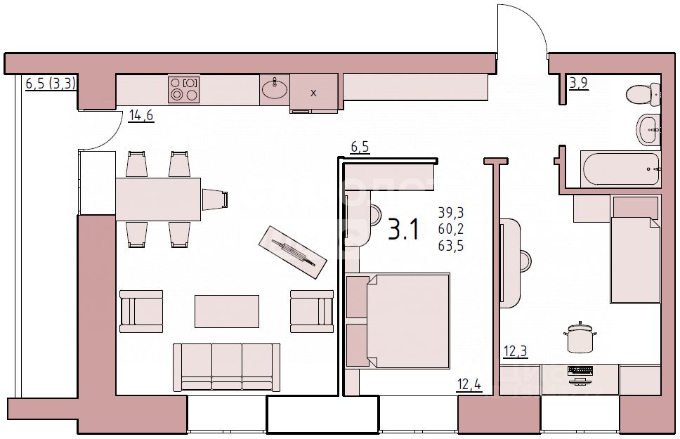 + санузел совмещенный, площадью 3.9 м2.