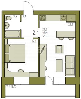 + евро-двушка с просторной кухней-гостинной, площадью 21.2 м2.