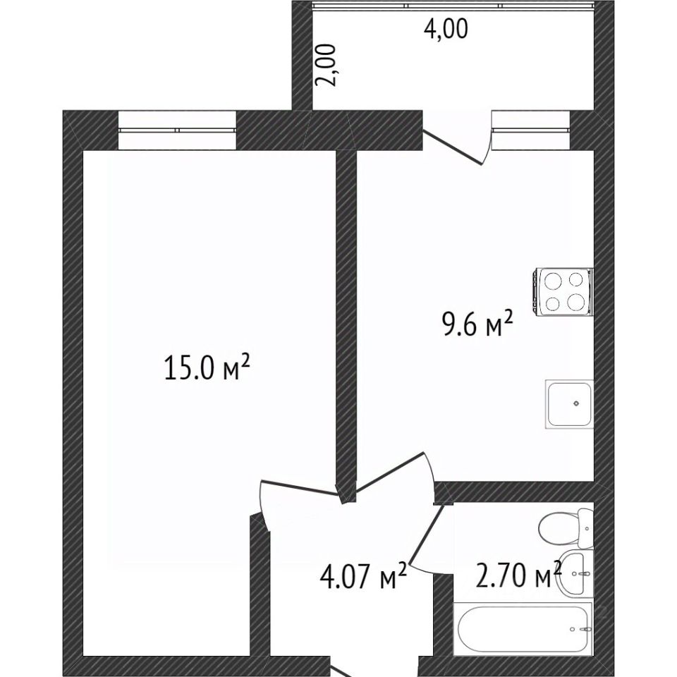 Квартира находится на 1-ом этаже, общая площадь составляет 31.1 кв. м без учёта балкона, кухня- 9.6 кв. м, комната- 15 кв. м, сделан косметический ремонт.