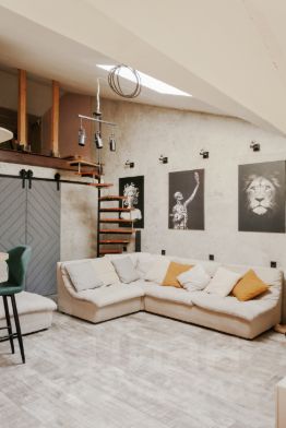 Высокие потолки, много света и воздуха — мансарда ощущается просторно и не давит.