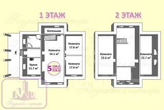 Общая площадь дома 216 кв/м, которые включают в себя: - кухню-гостиную + две спальни на первом этаже, дополняет функциональность этого дома - второй этаж, украшенный вторым светом, из которого выходят ещё две спальни.
