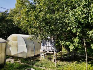 Также на территории есть большая летняя кухня, баня с дровяной печкой (топка снаружи), две теплицы, гараж, дровенник и сарай для хранения инвентаря. Туалет уличный. Два пруда с карасями добавляют уюта, а в тени винограда установлены качели.