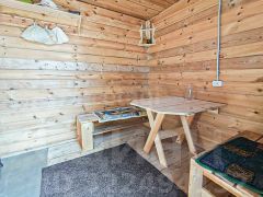 Дом общей площадью 35.2 кв.м., на 1-ом этаже предусмотрено два помещения и одно спальное место на 2-ом этаже. Двухскатная крыша, выполнена из металлочерепицы с утеплением пенопластом.