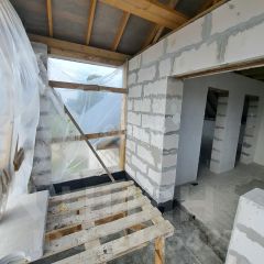 Первый этаж уже отштукатурен, а пластиковые окна с откосами обеспечивают яркое освещение и комфортный микроклимат. В доме проведены все необходимые коммуникации: электричество, вода из скважины, а также установлена надежная металлическая дверь. Газ находится всего в 3 метрах от дома, что делает его подключение максимально простым.