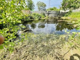 Ровный участок прямоугольной формы, на участке есть вагончик, есть свой пруд.