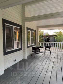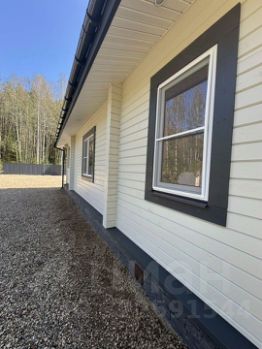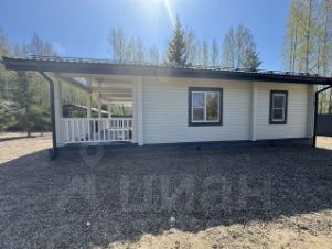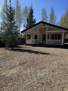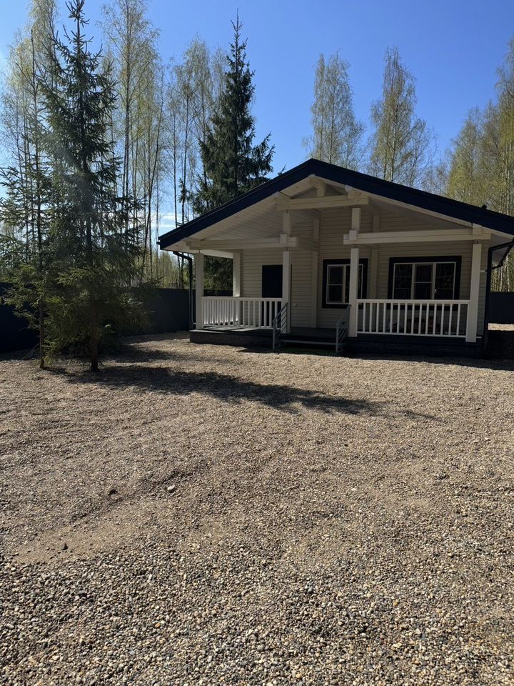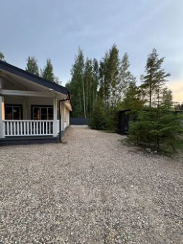 Дом в деревне Городище, который находится рядом с пляжем и Черной речкой. Дом окружен лесом, что создает приятную атмосферу уединения и близости к природе. На заднем плане видны деревья, среди которых преобладают березы и хвойные породы. Это создает живописный вид и обеспечивает тень в жаркие дни.