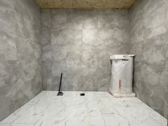 Пол - ламинат, поклеены обои в комнатах. Ванна - кварц винил, сделана гидроизоляция стен и пола.
