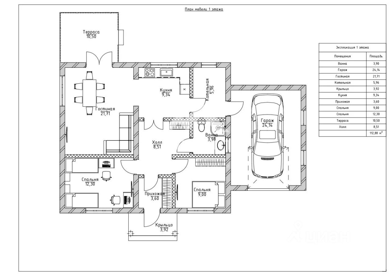 Общая площадь 120 кв.м. Удобная планировка : спальня 12,1 м кв, детская 9 м кв, зал- гостиная 21 м кв, кухня 12 кв.м, тех помещение - бойлерная 5.5 кв.м. В доме есть гаражное ромещение 24,5 м.кв