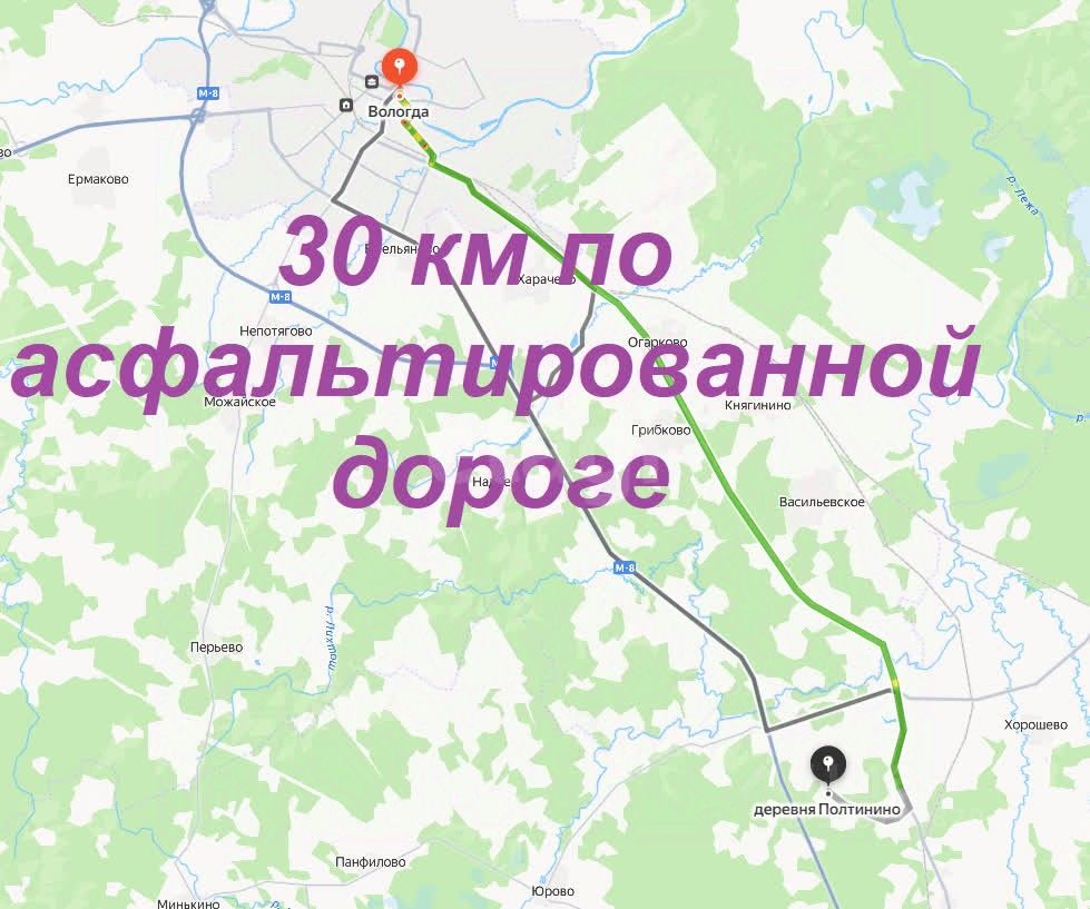 Участок находится в 30 км от города Вологды до Грязовца 15 км по хорошей асфальтированной дороге в деревне Полтинино.