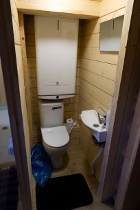 Все материалы в отделке максимально экологичные (дерево, окрашенное маслами с добавлением цвета), никаких пластиковых окон, натяжных потолков и аналогичных материалов.