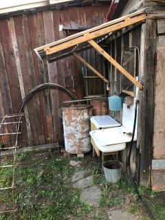 Есть сарайка, в которой установлена душевая кабина, водонагреватель на 80 л., раковина, подключена горячая и холодная вода. Вода из колодца. Сделана разводка труб по участку, заведена в дом.