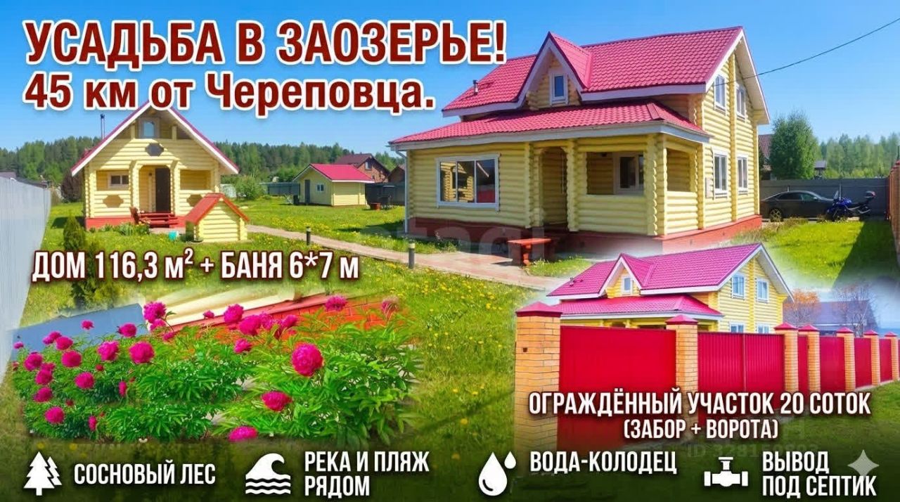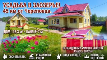 Продается просторный двухэтажный дом из оцилиндрованного бревна площадью 116 кв. м на участке 20 соток в деревне Заозерье, в 45 км от Череповца.