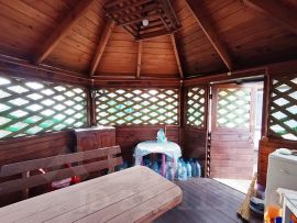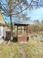 На участке 9 соток расположены: железный гараж, баня, беседка, две теплицы, дровянник, сарай, колодец, грядки под посадки, плодовоягодные и декоративные деревья, пруд для полива, оборудовано парковочное место.