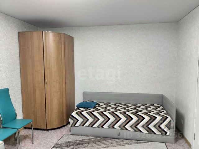 В комнате: одноместная кровать, большой шифоньер для одежды и других вещей, рабочий стол и полки.