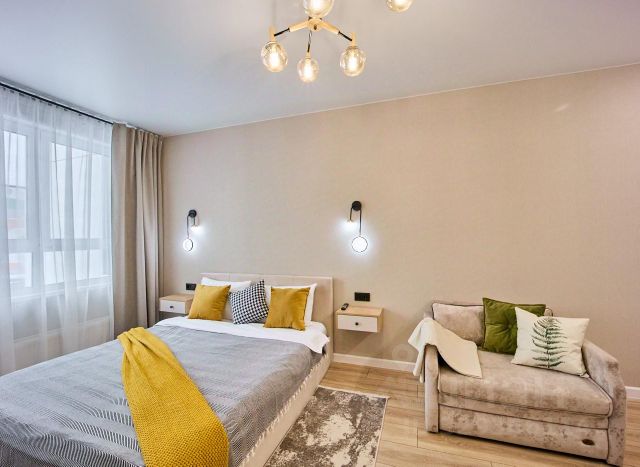 1 ) В отдельной комнате двуспальная кровать с пружинным матрасом (140х200), 100% хлопковое постельное белье, подушки 70х70, шторы БЛЭКАУТ.