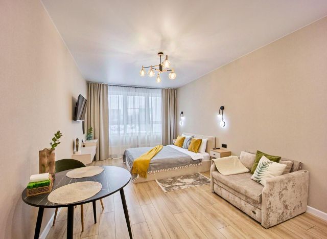 Включено: 1 комплект белья на двуспальную кровать, 1 комплект полотенец на каждого гостя. Дополнительный комплект на диван - 300 руб. (бесплатно при бронировании от 2 суток).